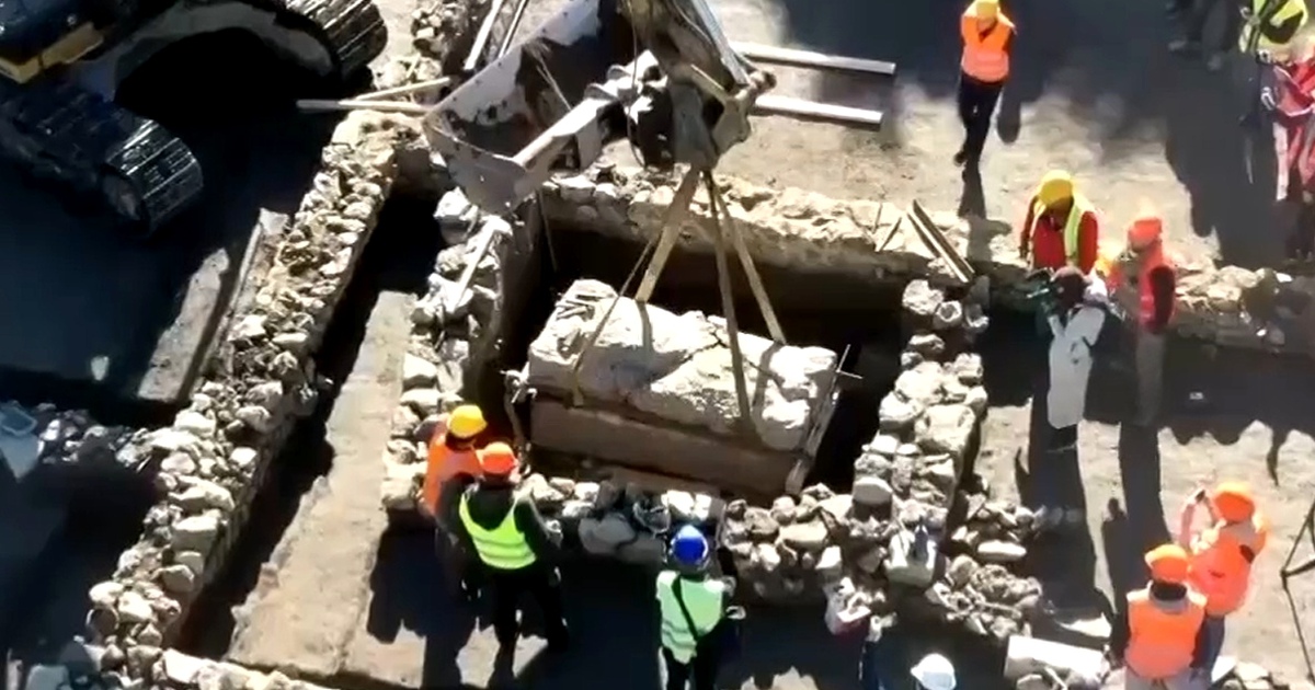 Саркофаг был вскрыт прямо на месте раскопок; для этого использовали экскаватор. Внутри археологи обнаружили останки молодой женщины и богатые погребальные дары.