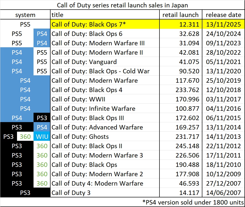 Продажи версии Call of Duty Black Ops 7 для PlayStation 5 оказались на уровне 12311 копий, тираж версии для PlayStation 4 составил менее 1800 копий. На Xbox игры в Японии практически не продаются, о ПК нет данных.