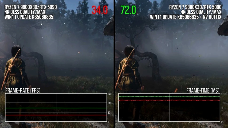 В Nvidia тоже поверили жалобам игроков: компания выпустила обновленный драйвер, предположительно уменьшающий просадку производительности. В Digital Foundry протестировали и его; оказалось, фикс действительно повышает фреймрейт на системах с KB5066835.