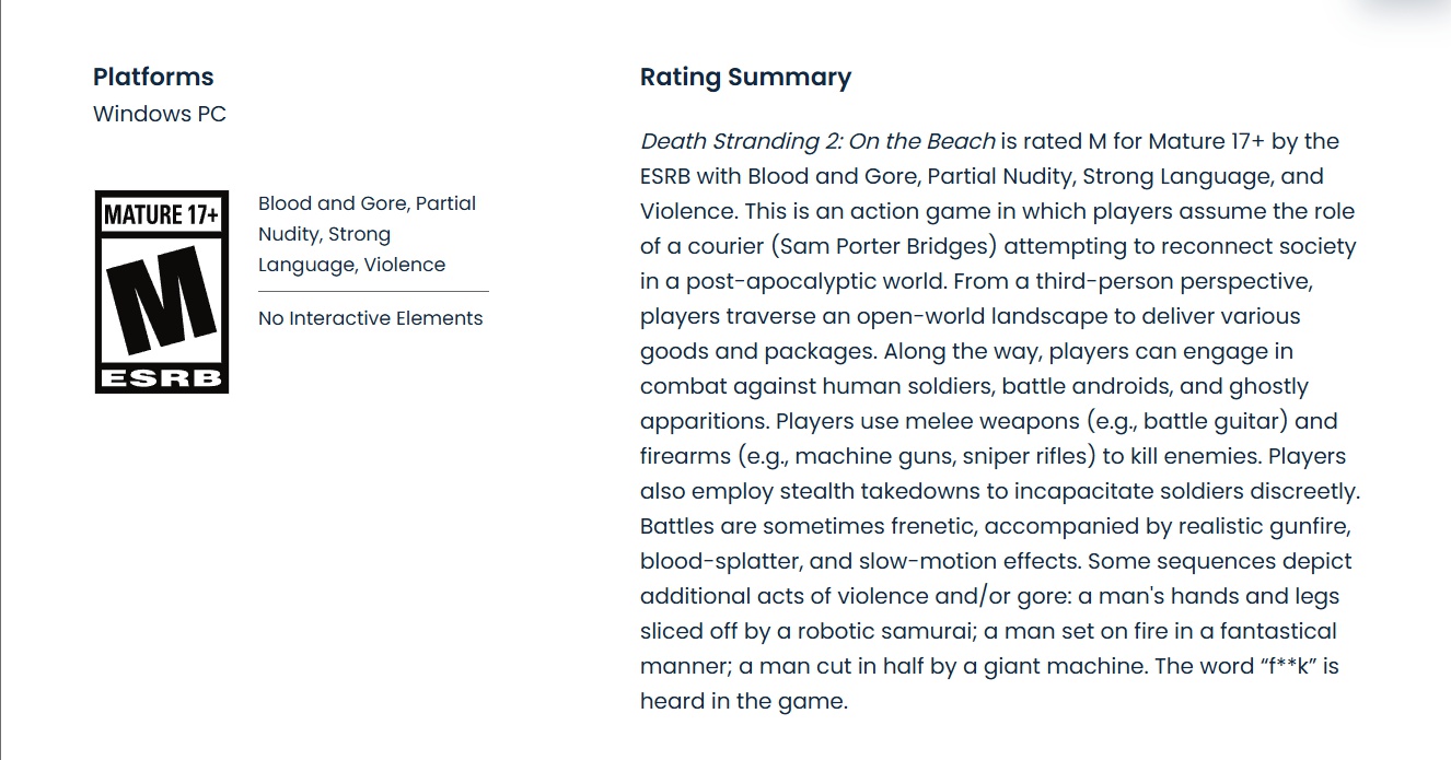 Рейтинговое агентство ESRB выдало возрастной рейтинг ПК-версии Death Stranding 2. Игра получила рейтинг M — точно такой же, как и версия Death Stranding 2 для PlayStation 5.