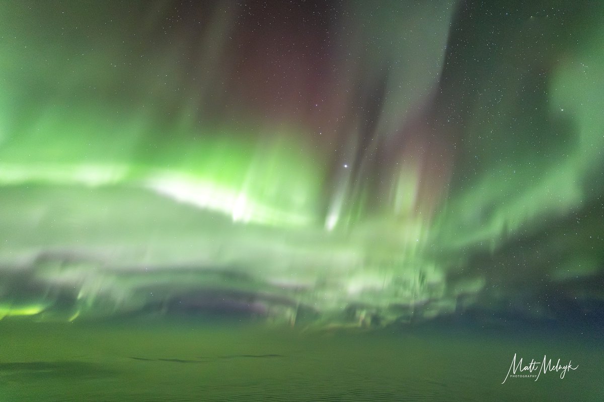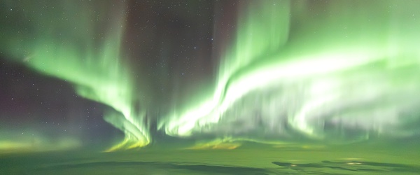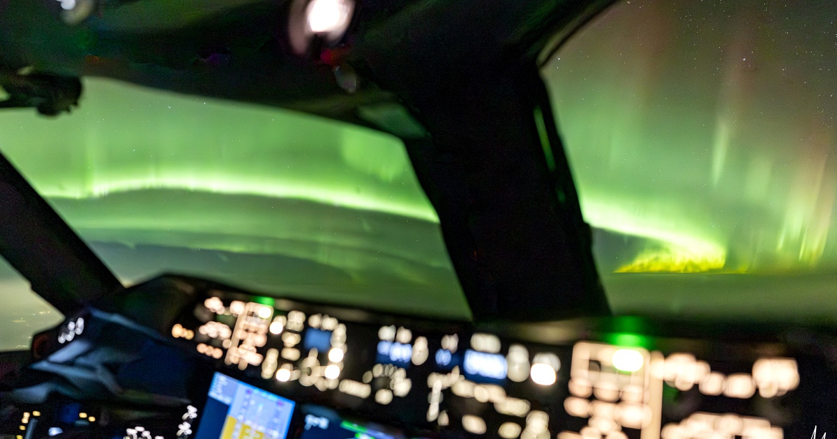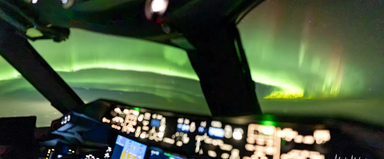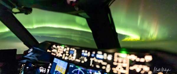 Пилот Мэтт Мельник, регулярно летающий в районе США и Канады, смог сделать несколько эффектных кадров полярных сияний прямо из кабины своего самолета. Во время съемки самолет Мэтта летел на высоте около 12 километров; по словам пилота, сияния непрерывно продолжались около 5 часов.