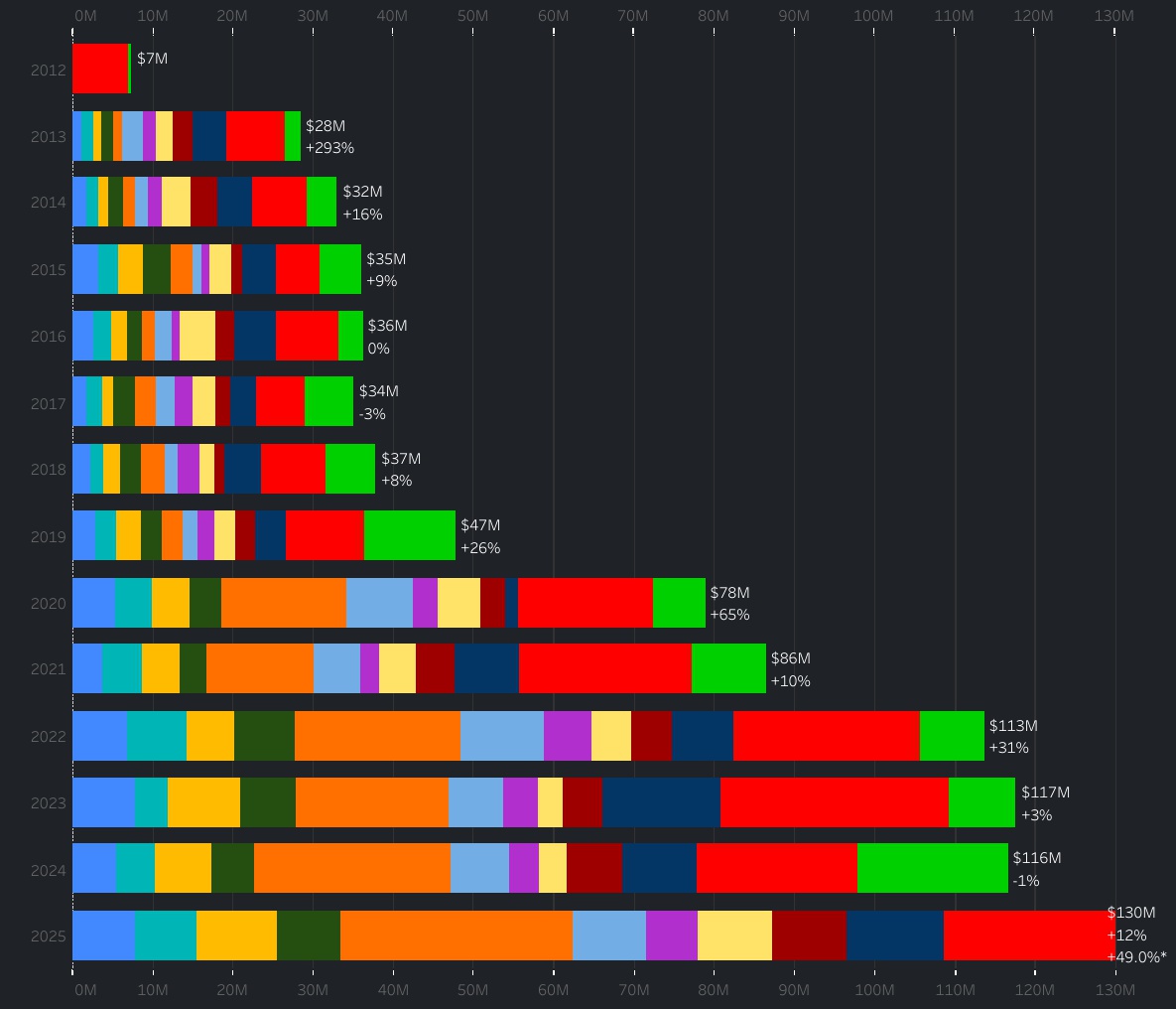 Судя по данным фанатского сайта, отслеживающего краудфандинговую кампанию Star Citizen, лучшими месяцами в 2025 году стали май и ноябрь: было привлечено $29 миллионов и $22 миллиона соответственно.
