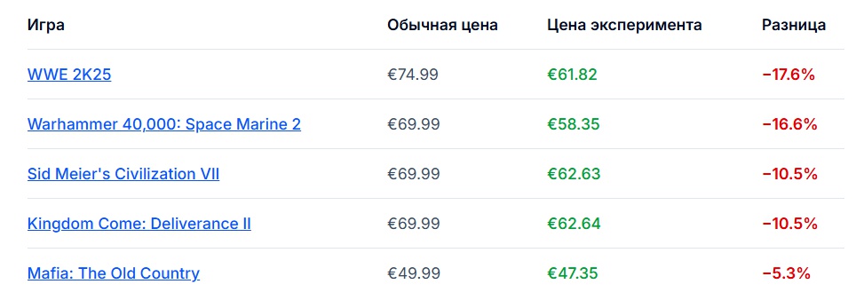 В рамках эксперимента игрокам могут предлагать разные цены на одни и те же игры. По данным сервиса, «скидка» в ходе эксперимента может превышать 17%, но сильно варьируется от игры к игре.
