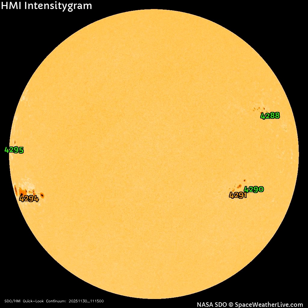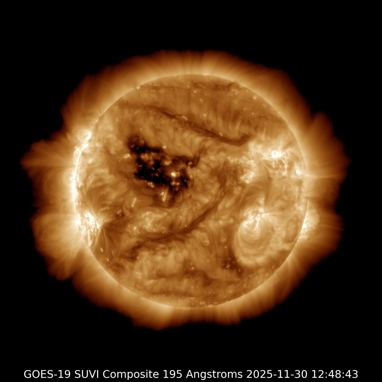 Помимо новых крупных пятен на Солнце видна очередная корональная дыра. Поток частиц из нее может достичь Земли ближе к середине первой недели декабря, если новые пятна удачно выдадут вспышки, то примерно тогда же их энергия может достичь Земли.