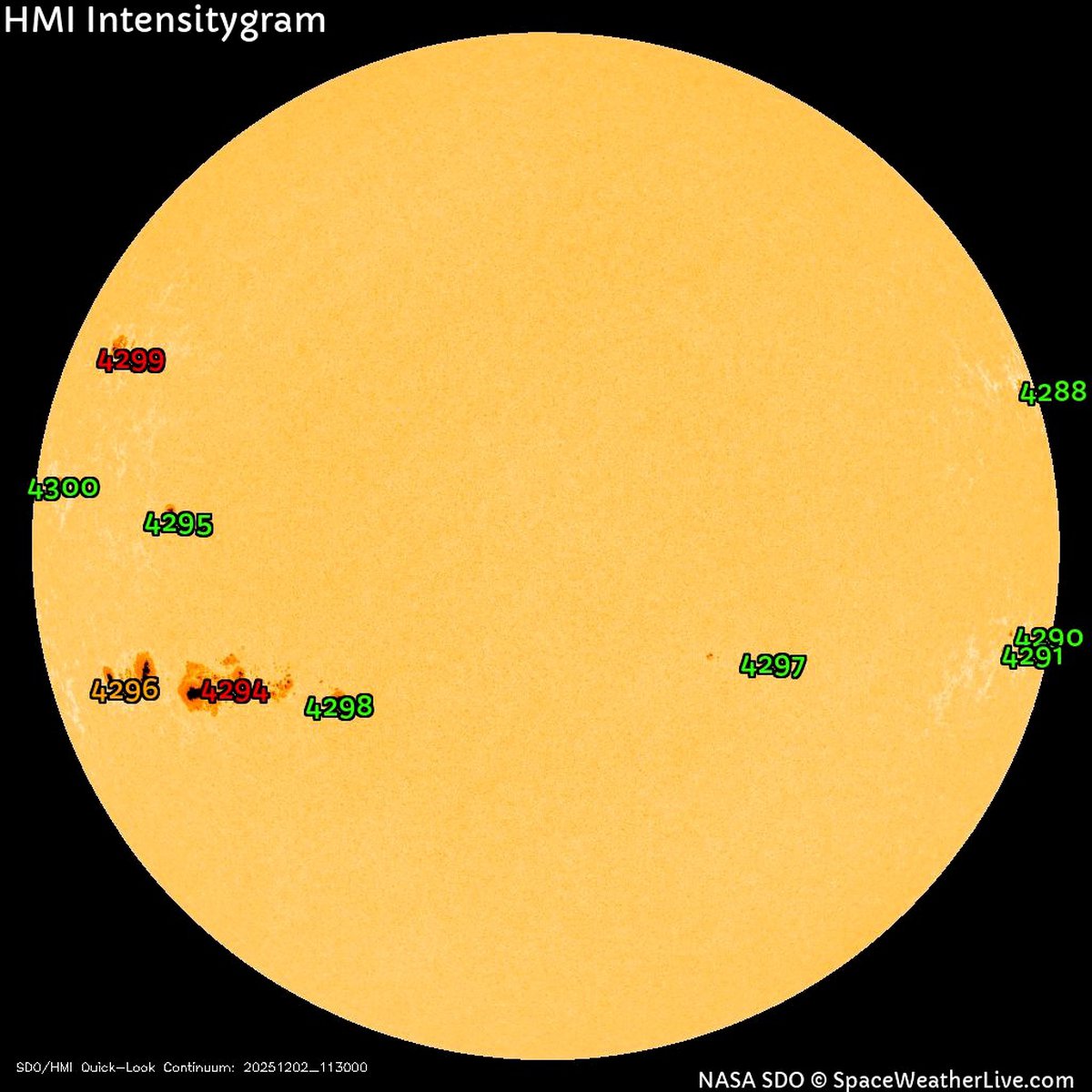 В ближайшие дни ожидаются новые мощные вспышки на Солнце, несущие с собой корональные выбросы массы и магнитные бури. Их источниками будут крупные пятна AR4296, AR4299 и AR4294, обладающие нестабильными магнитными полями.