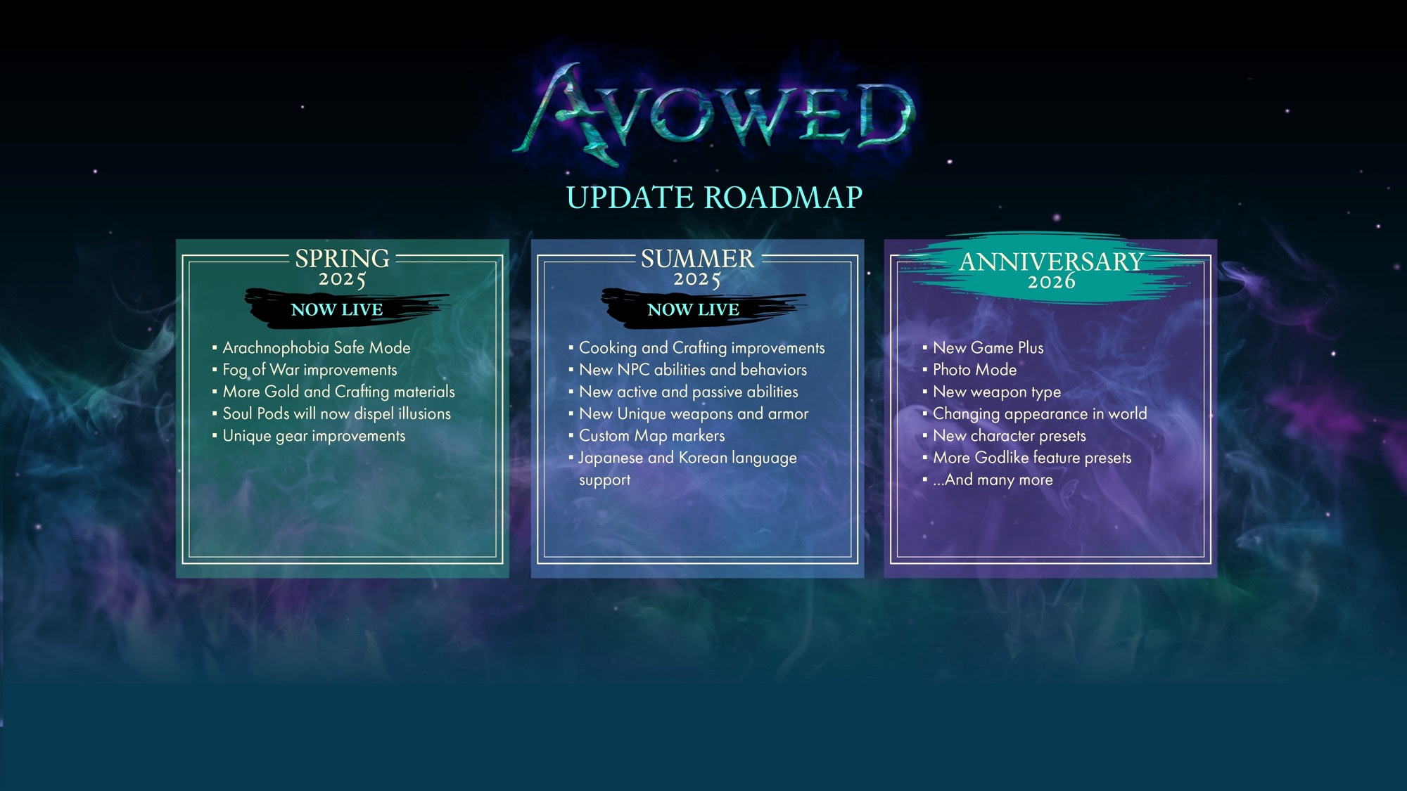Вместо осеннего обновления Obsidian Entertainment выпустит для Avowed апдейт, приуроченный к первой годовщине выпуска игры. В обновление войдут возможности, изначально планировавшиеся для осеннего патча.