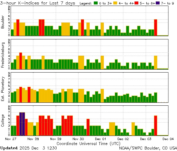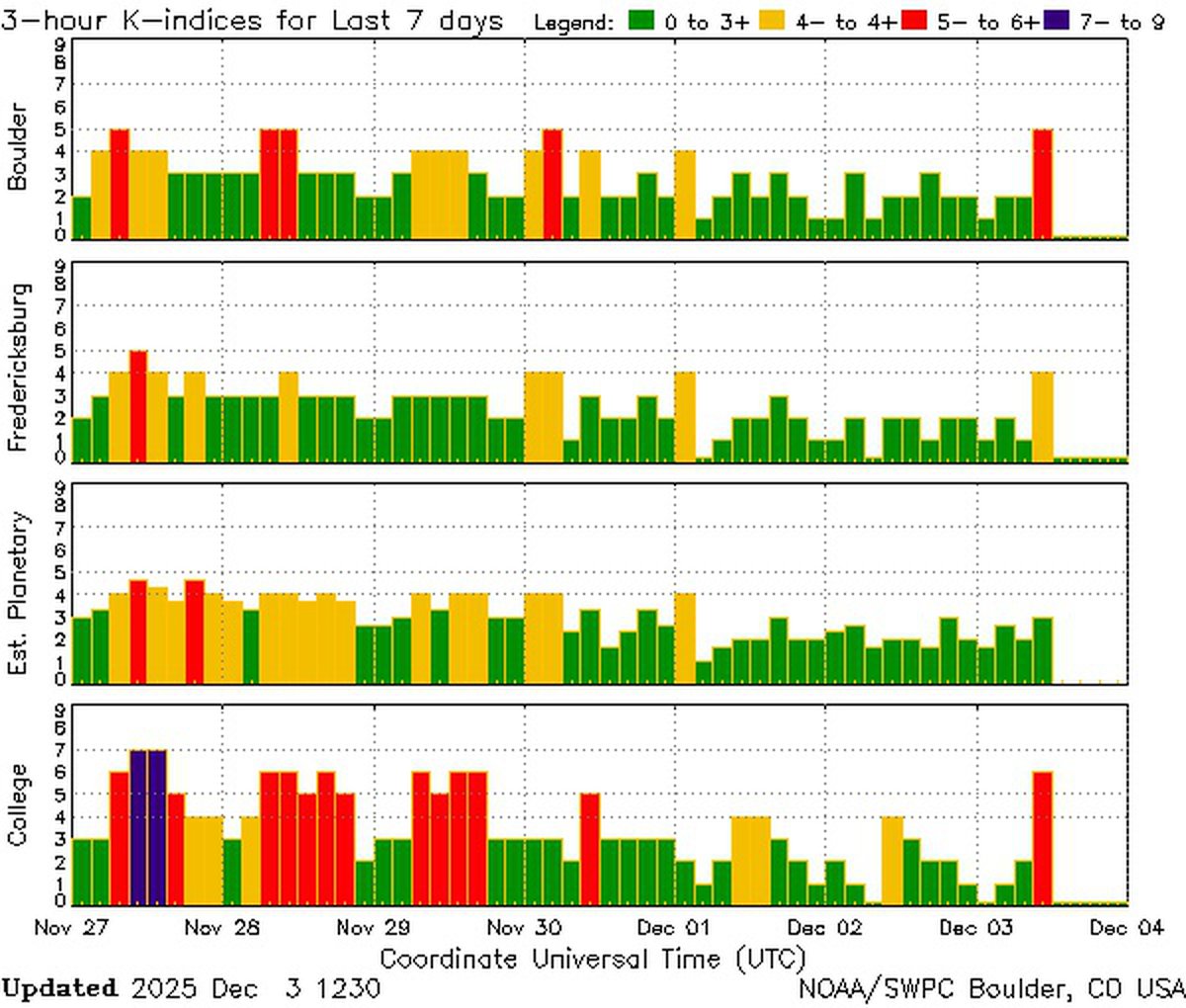 Хотя после полудня 4 декабря буря стихнет, геомагнитная обстановка продолжит оставаться напряженной. Аналитики ожидают, что 4-5 декабря индекс геомагнитной активности Kp будет на уровне 3-3.3 балла (буря начинается от 4.6 балла).