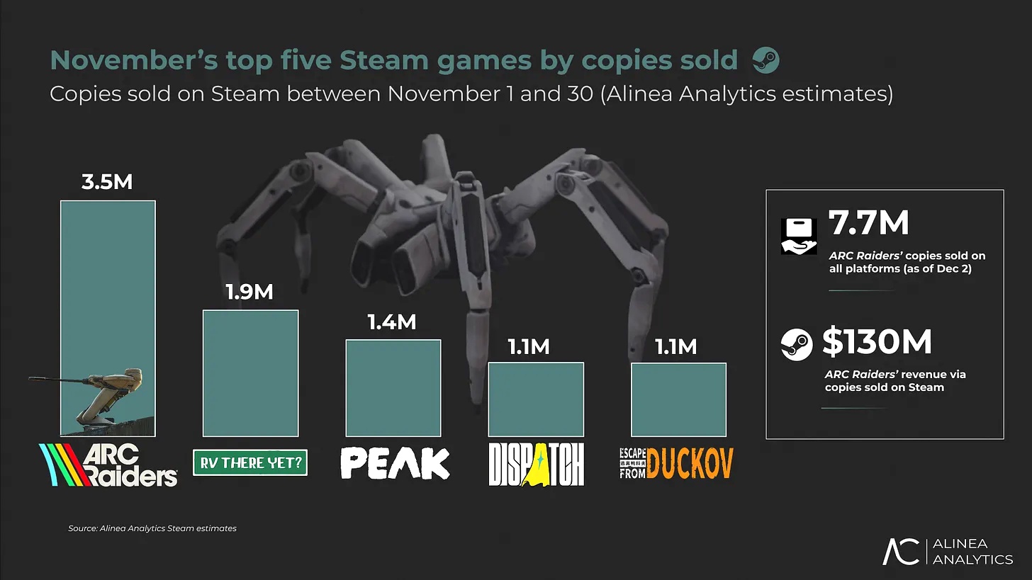 Аналитика: ARC Raiders — самая продаваемая игра ноября в Steam, Dispatch на 4 месте.