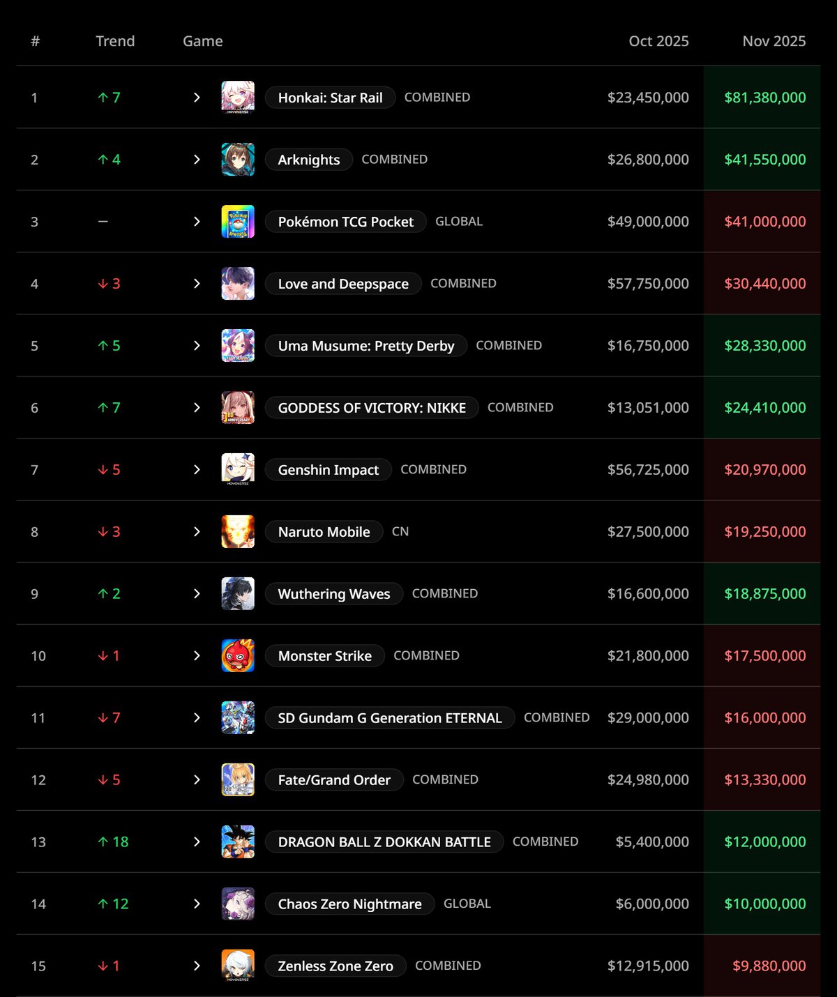 С другой стороны, хорошие результаты показывает Honkai: Star Rail, еще один проект miHoYo. Выручка игры по сравнению с октябрем выросла в несколько раз и достигла $81.3 миллиона против $23.4 миллиона.