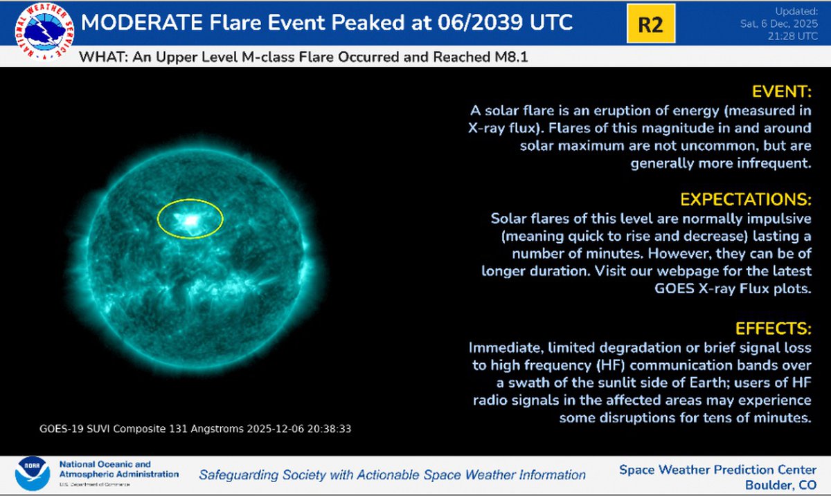 Корональный выброс массы тоже движется к Земле, но гораздо медленнее. Согласно предварительным прогнозам, он достигнет планеты в районе 9 декабря, инициировав геомагнитную бурю класса G2 или G3.
