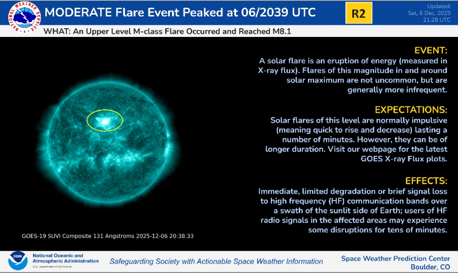 Корональный выброс массы тоже движется к Земле, но гораздо медленнее. Согласно предварительным прогнозам, он достигнет планеты в районе 9 декабря, инициировав геомагнитную бурю класса G2 или G3.