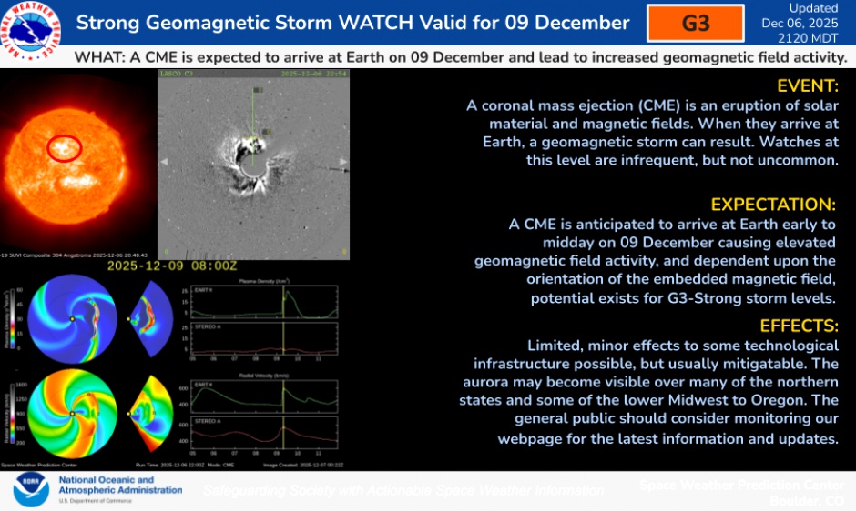 Затем геомагнитная обстановка улучшится, ночью 9 декабря индекс геомагнитной активности Kp опустится ниже 2 баллов (буря начинается при 4.6). Но вскоре после этого Землю настигнет корональный выброс массы.