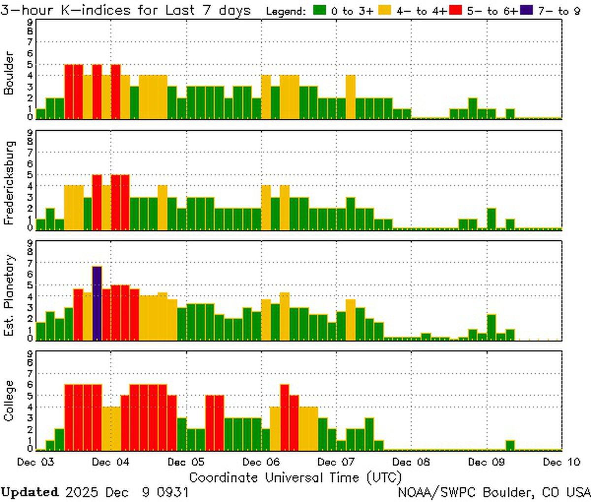 К середине дня 9 декабря детекторы NOAA фиксируют крайне спокойную геомагнитную обстановку. Можно было бы предположить, что у агентства вышли из строя детекторы во всех регионах, но кое-какие данные от них все-таки поступают.