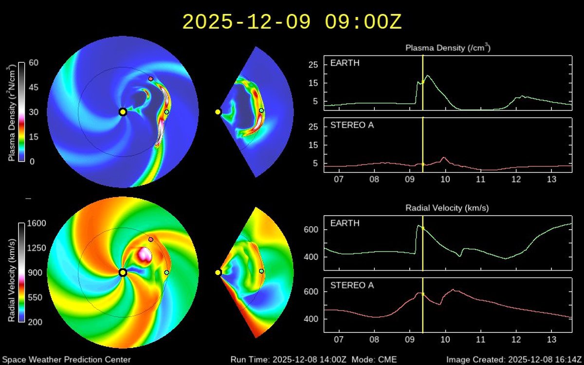 Вероятно, следующая магнитная буря на Земле начнется 12 декабря: в этот день до планеты доберется отголосок недавнего коронального выброса массы. Основная часть выброса, если верить модели WSA-Enlil, ушла в сторону от планеты.