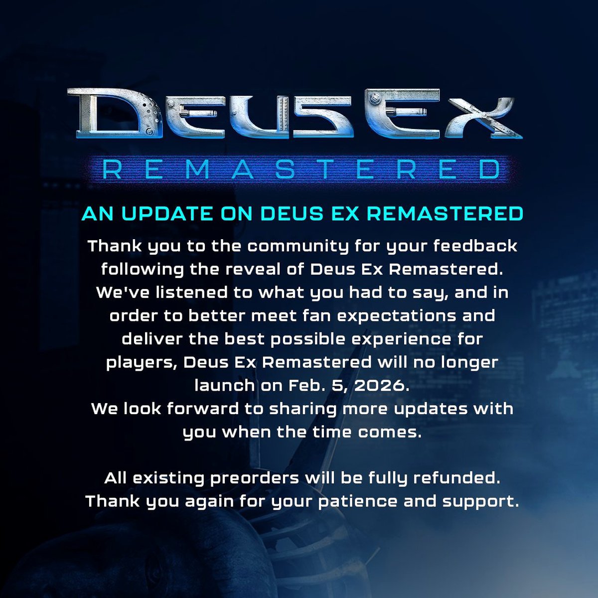 Ремастер первой части Deus Ex не будет выпущен 5 февраля 2026 года. Компания Aspyr, занимающаяся проектом, объявила о переносе релиза игры на неопределенный срок.