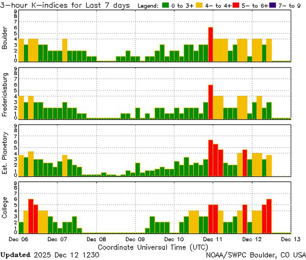 Как минимум с 9 декабря прогнозы аналитиков идут вразрез с реальной геомагнитной обстановкой. Например, 12 декабря ожидалась относительно стабильная магнитосфера, однако сейчас детекторы NOAA говорят о локальных магнитных бурях.