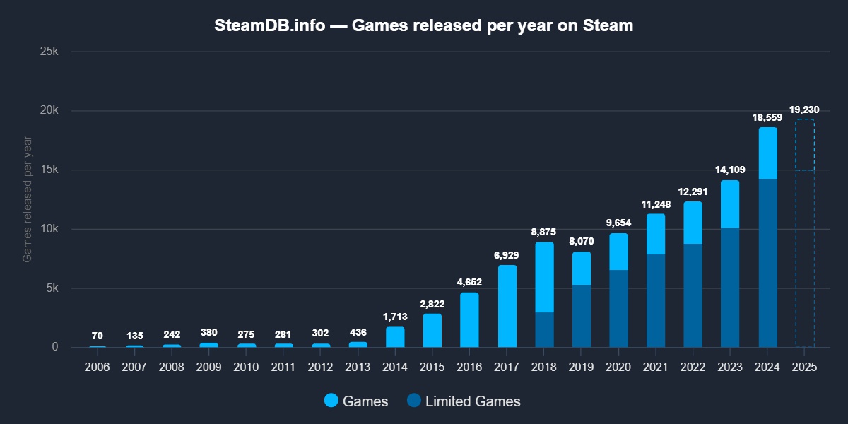 2025 год еще не закончился, а в Steam уже выпущено 19230 игр, подсчитал сервис SteamDB. Это рекордный показатель, за весь 2024 год вышло лишь 18559 проектов.