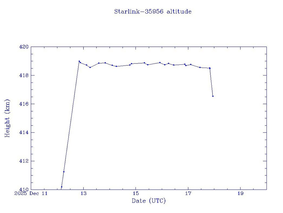 Сейчас спутник 35956 находится на высоте около 416 километров, он летает ниже орбиты МКС и большей части остальной спутниковой группировки Starlink. Аппарат может представлять опасность для спутников на более низких орбитах и ракет, выводящих в космос полезную нагрузку.