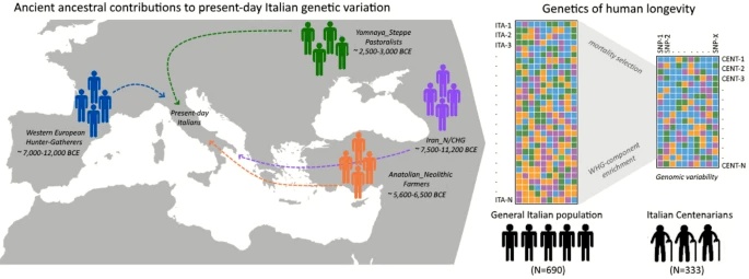Исследование основано на анализе 1126 геномов: 333 столетних долгожителя, 690 итальянцев среднего возраста в качестве контрольной группы, а также 103 древних генома. Сопоставляя данные ДНК, ученые стремились определить, какие именно исторические популяции могли внести вклад в увеличение долголетия.