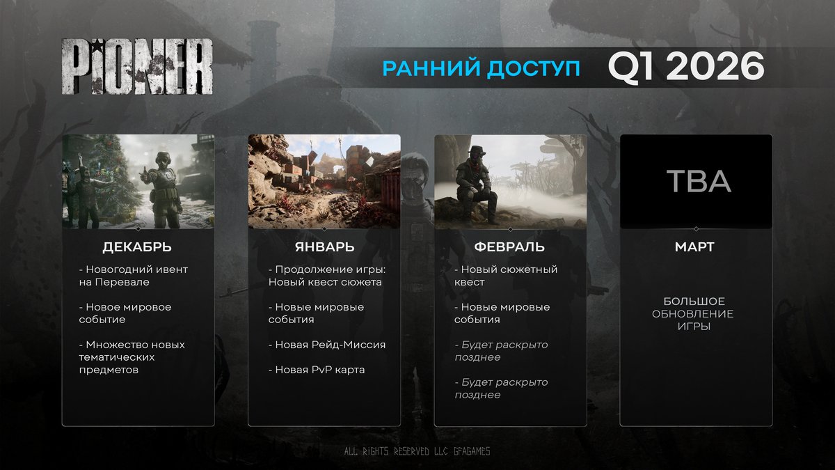 О планах на февраль разработчики пока говорят скупо: Pioner получит новое задание и мировые события, а также некий неанонсированный контент. О мартовском патче известен лишь сам факт его существования.