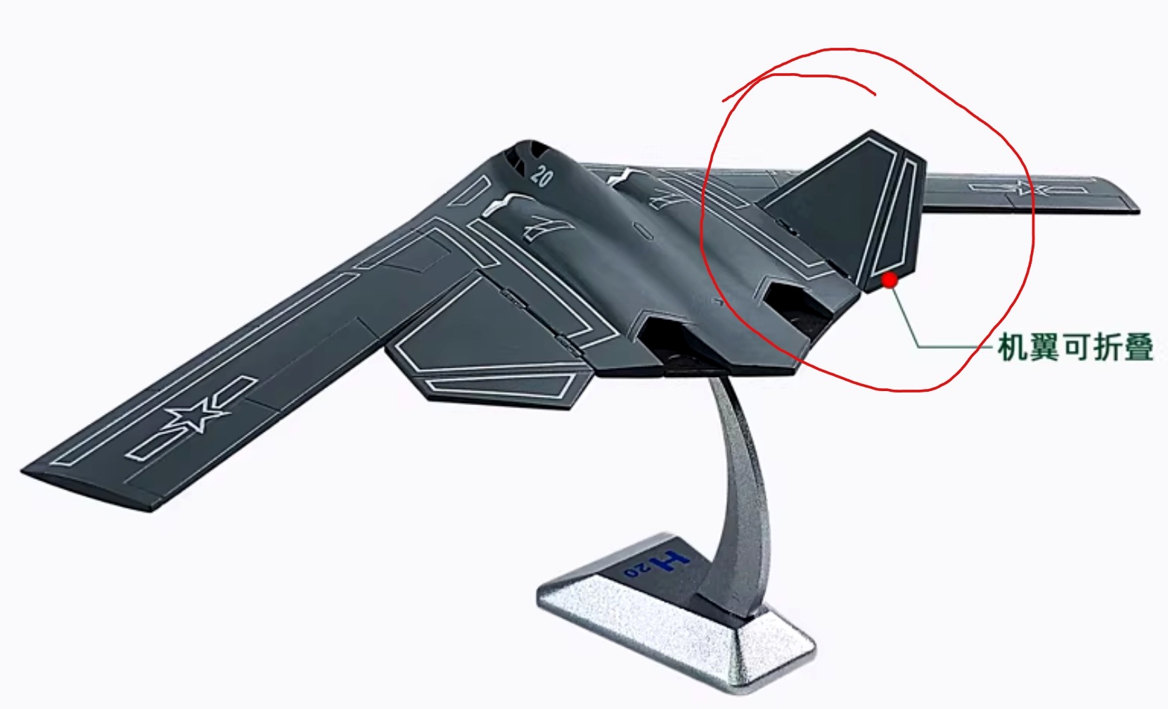 На первый взгляд кажется, что модель показывает бомбардировщик, построенный по схеме «летающее крыло», но на самом деле хвостовое оперение просто может складываться и раскладываться.