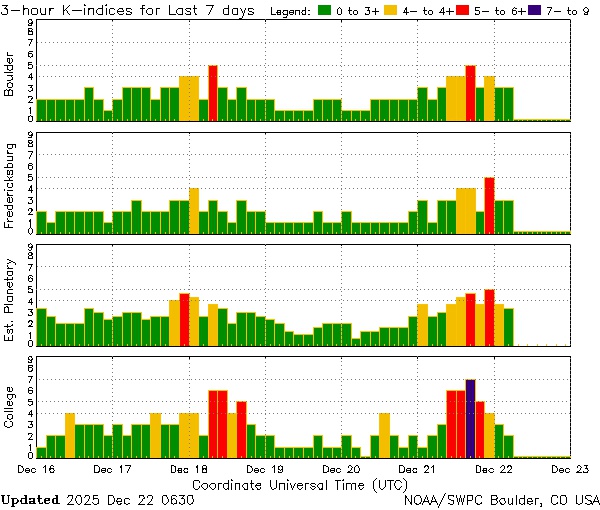 Изначально аналитики NOAA ожидали увидеть магнитную бурю только в ночь с 22 на 23 декабря. Этот прогноз еще в силе: предполагается, что ночью до Земли доберется поток солнечного ветра из корональной дыры.