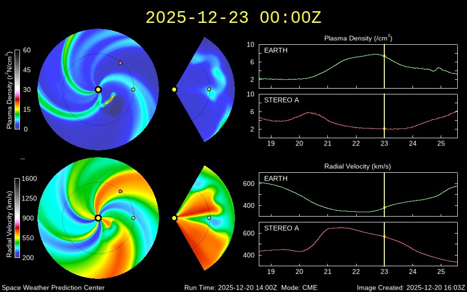 Предварительно аналитики ожидают, что 24 декабря геомагнитная обстановка будет лишь немного спокойнее, чем 23 декабря. В этот день мимо Земли должен пройти корональный выброс массы от недавней солнечной вспышки.