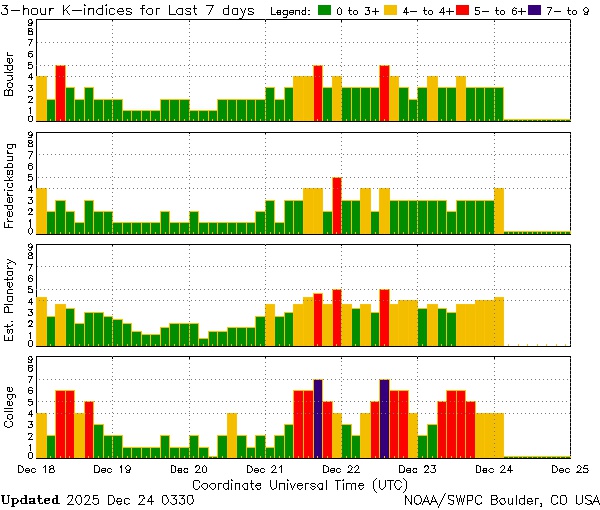 В прогнозе магнитных бурь на 24 декабря штормы не упоминались, но реальность оказалась иной. Утром 24 декабря аналитики NOAA США пересчитали прогноз, теперь ожидается магнитная буря почти на половину дня.