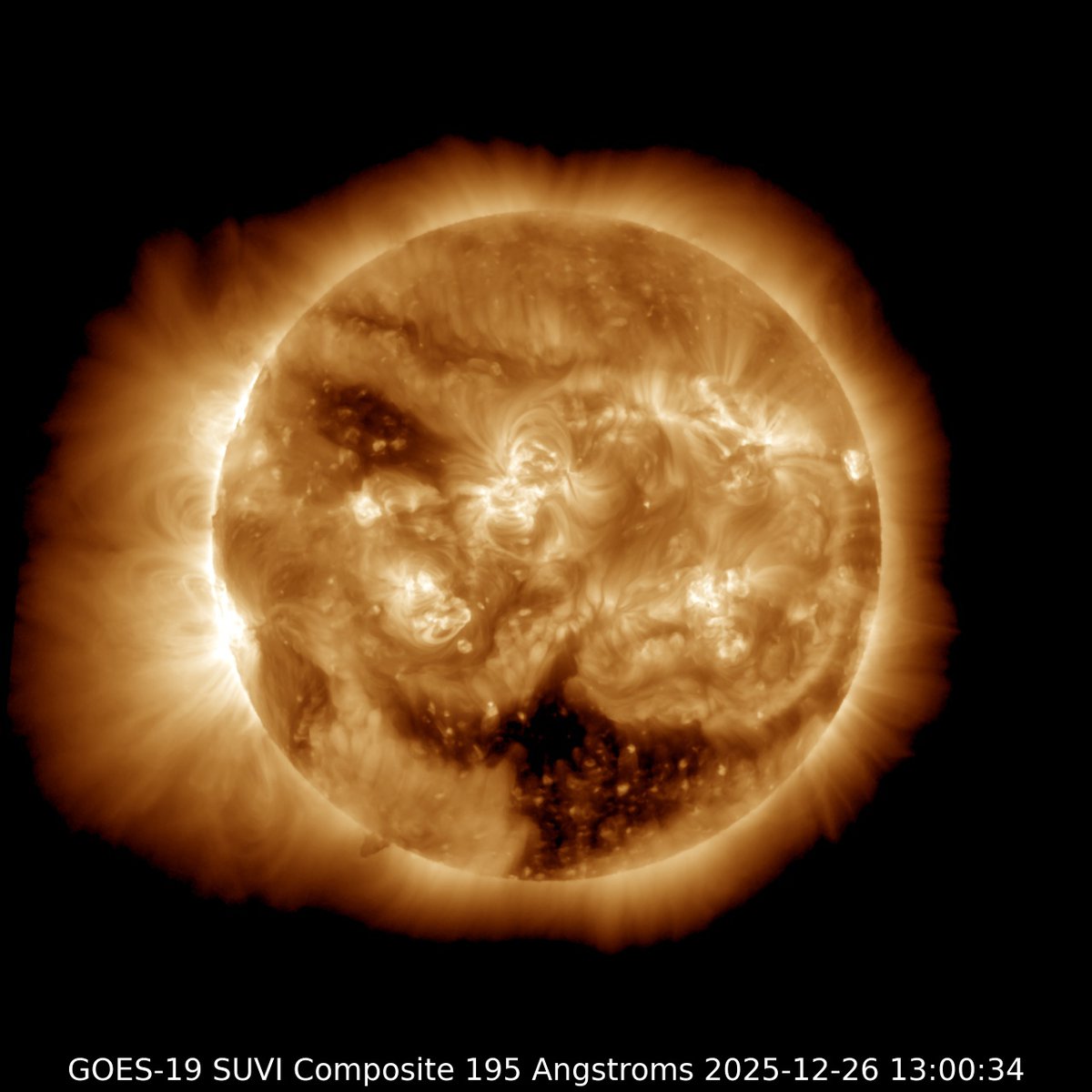 Правда, передышка будет недолгой. На поверхности Солнца видно несколько корональных дыр, постепенно поворачивающихся к Земле; поток плазмы из этих дыр доберется до нашей планеты в районе 31 декабря или 1 января.