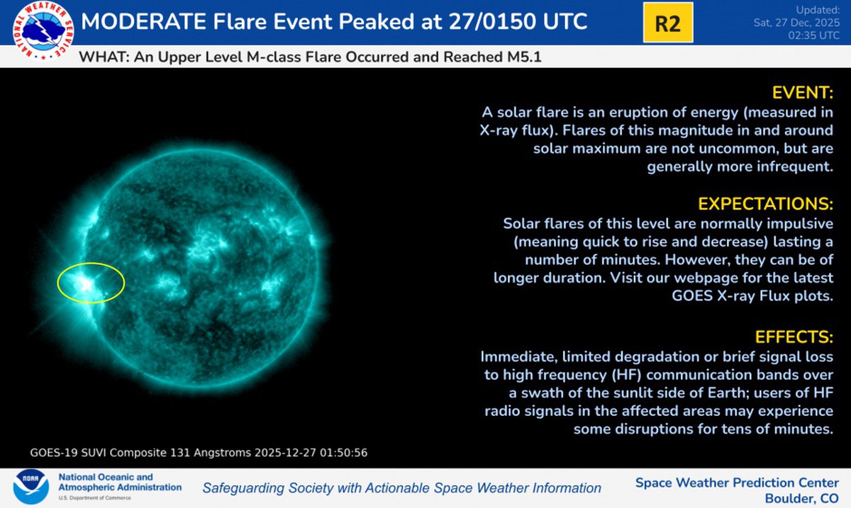 Рано утром 27 декабря на Солнце произошла мощная вспышка. Источник вспышки находился либо на самой границе видимой части звезды, либо за ней; на снимках Солнца видно лишь зарево вспышки, поднимающееся над горизонтом.