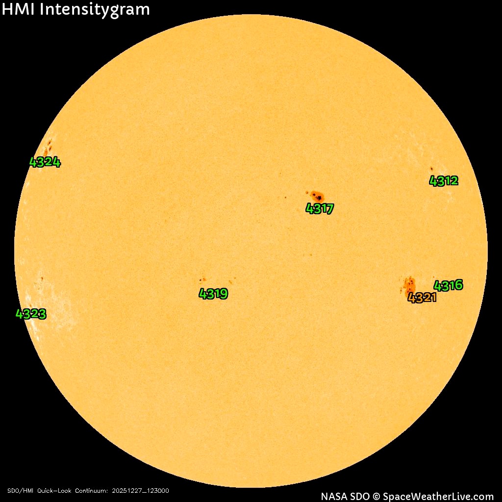 Судя по снимкам Солнца, вскоре на Землю могут нацелиться сразу несколько активных пятен; на границе диска видно характерное сияние. Если дело дойдет до корональных выбросов, то магнитные бури на Земле начнутся не раньше первых чисел января.