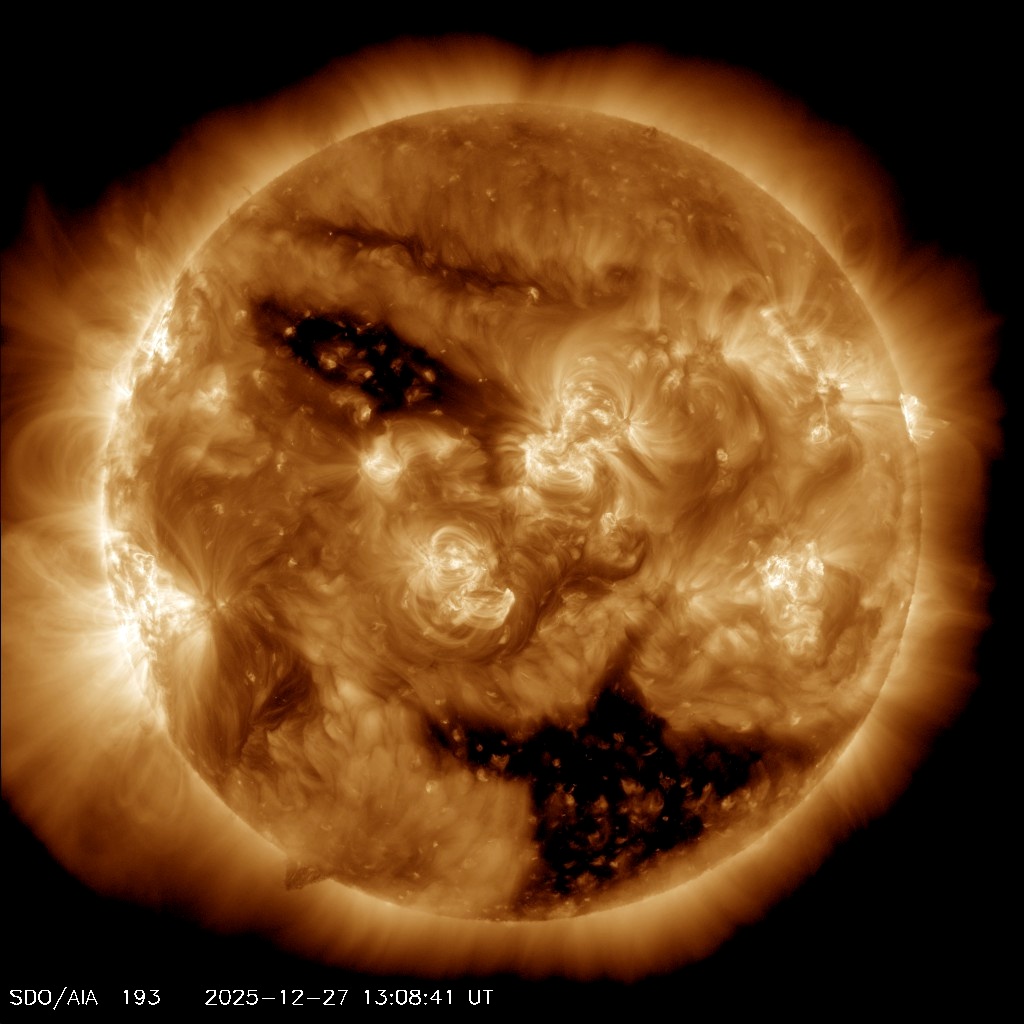 29 декабря предварительный прогноз тоже обещает отсутствие геомагнитных бурь, но дальше всё может поменяться. Во-первых, на Землю нацеливается крупная корональная дыра в атмосфере Солнца, испускающая поток плазмы.