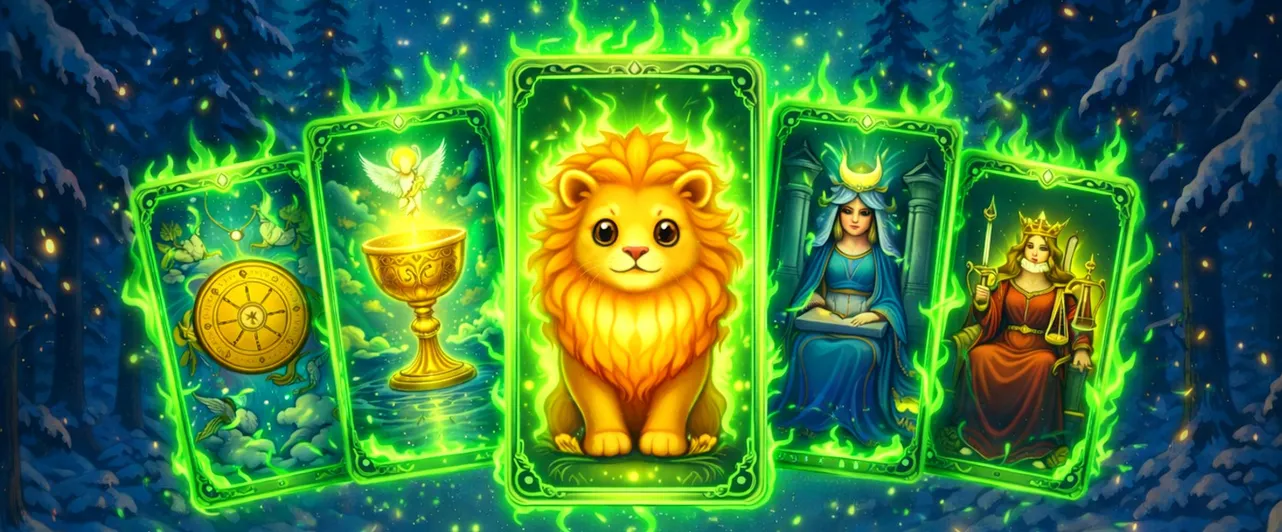 Лев: «Король Жезлов», «Семерка Кубков», «Двойка Пентаклей»
