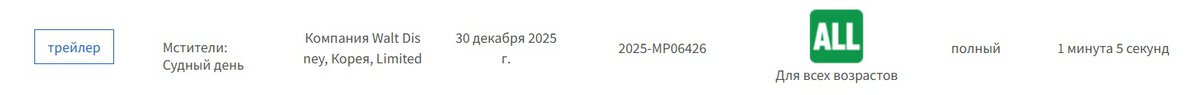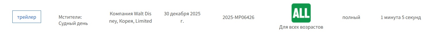 Видимо, фильм «Мстители: Судный день» получит «бонусный» пятый тизер. Упоминание ролика обнаружили в базе рейтингового агентства Южной Кореи, судя по базе, тизер идет 1 минуту 5 секунд.