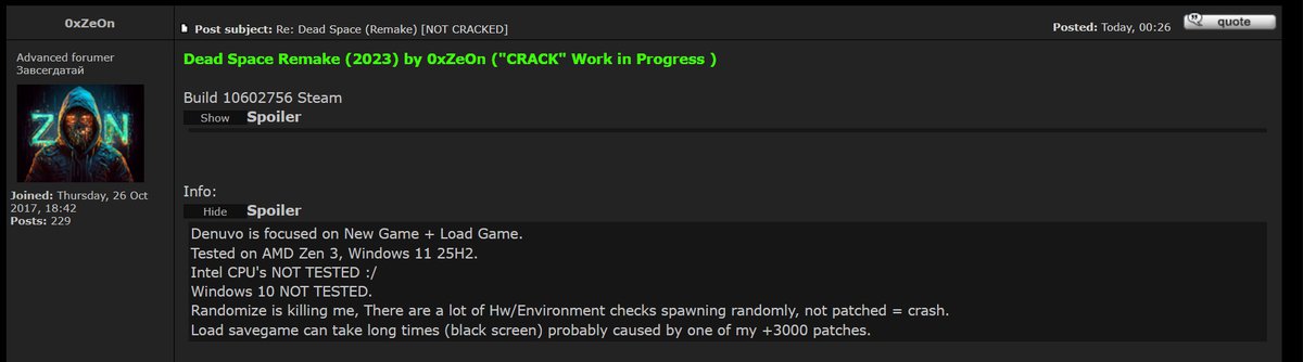 Защиту ремейка Dead Space обошел взломщик под ником 0xZeOn. На этот раз речь идет именно о взломе, а не о генерации ключей, обход Denuvo в новой версии Dead Space находится на этапе разработки.