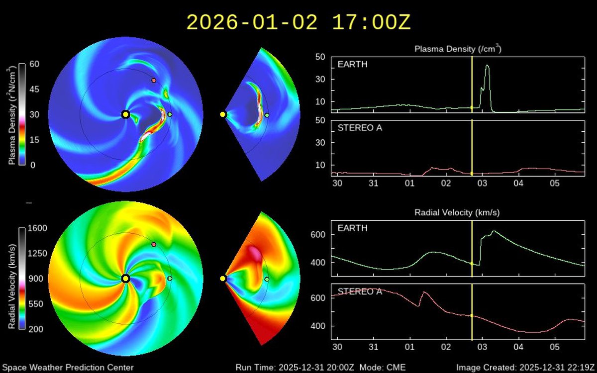 Судя по модели распространения солнечного ветра WSA-Enlil, Земля пройдет через самый центр фронта коронального выброса массы. Это значит, что геомагнитная буря 3 января вряд ли будет сильнее, чем в прогнозе, но может оказаться слабее, если траектория выброса окажется немного иной.