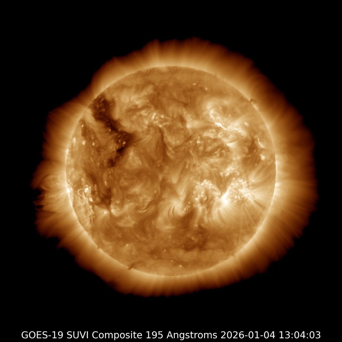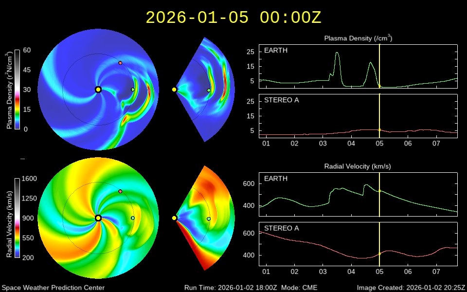 Ситуация может измениться уже 7 января. Согласно модели распространения солнечного ветра WSA-Enlil, ближе к вечеру до Земли доберется поток частиц из новой корональной дыры; возможно, на Рождество произойдет магнитная буря класса G1.