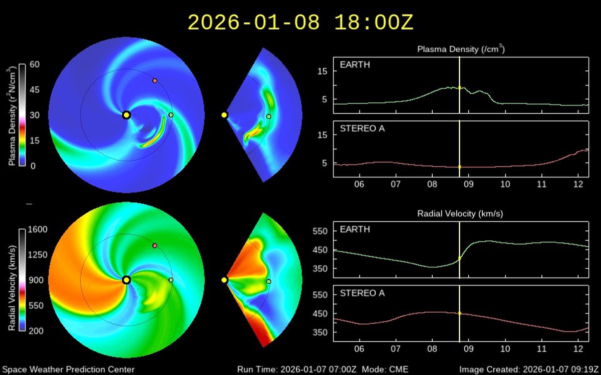 Согласно основному прогнозу, геомагнитная обстановка 8 января будет нормальной, а магнитная буря начнется 9 января. Согласно модели распространения солнечного ветра WSA-Enlil, Земля войдет в поток частиц уже 8 января.