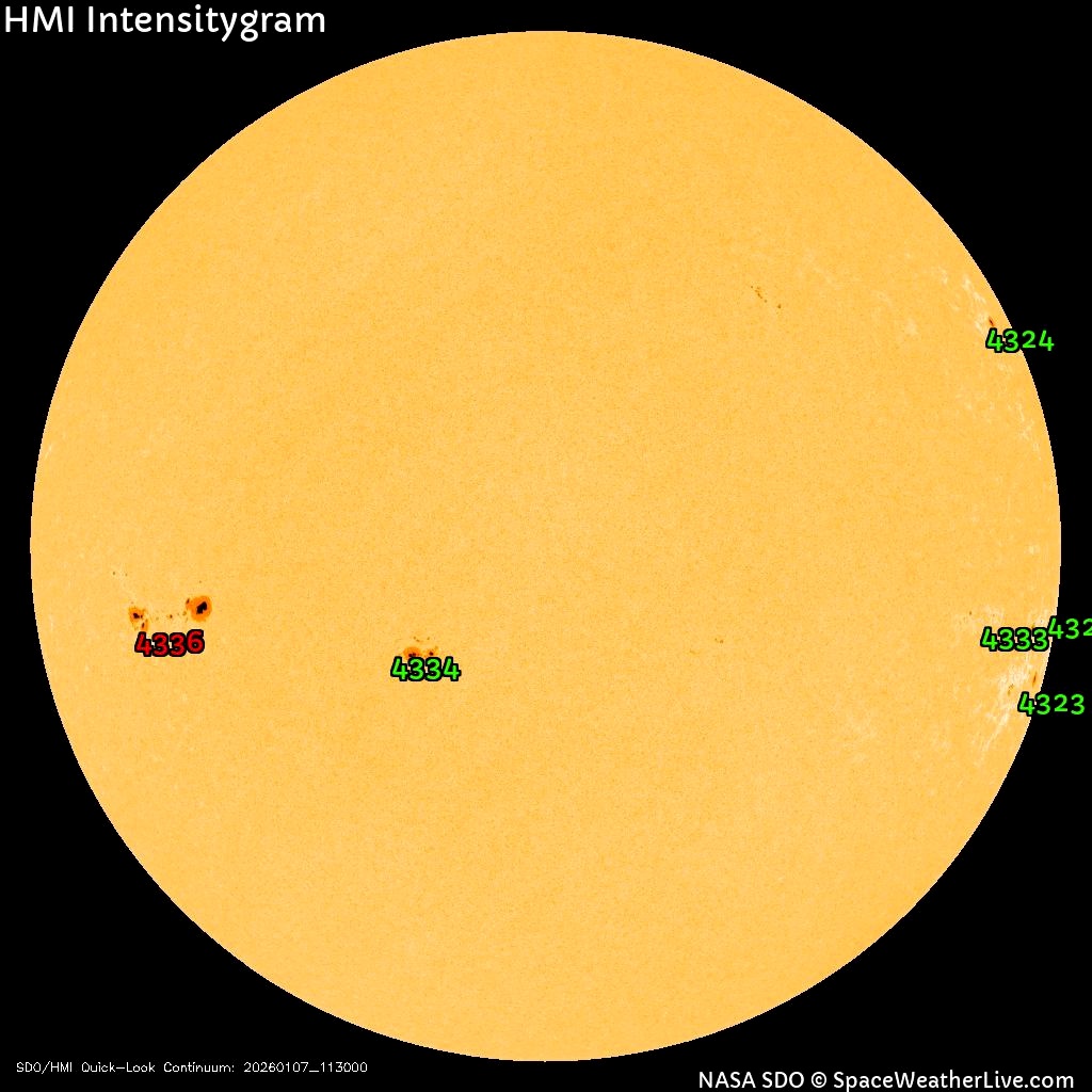 На Солнце пока нет мощных вспышек с корональными выбросами массы, но они возможны. Спутники фиксируют пятно AR4336 с нестабильным магнитным полем, появившееся из-за границы солнечного диска.