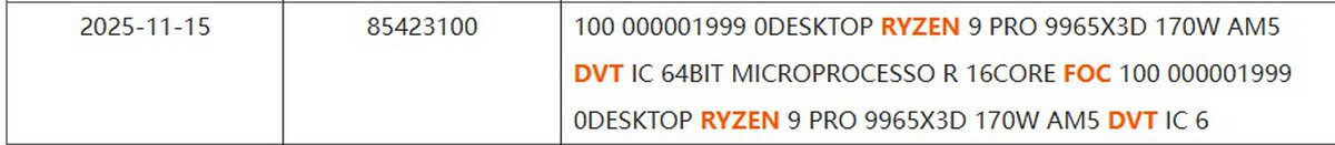 В базе грузовых манифестов NBD найдено упоминание неанонсированного процессора AMD Ryzen 9 Pro 9965 X3D. Согласно манифесту, это 16-ядерный процессор с энергопотреблением на уровне Ryzen 9 9950 X3D.