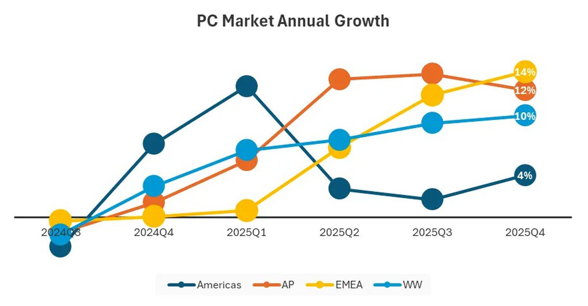 Согласно последнему отчету IDC, объем поставок ПК в конце 2025 года вырос почти на 10% по сравнению с аналогичным периодом 2024 года. В общей сложности было отгружено 76.4 миллиона ПК.