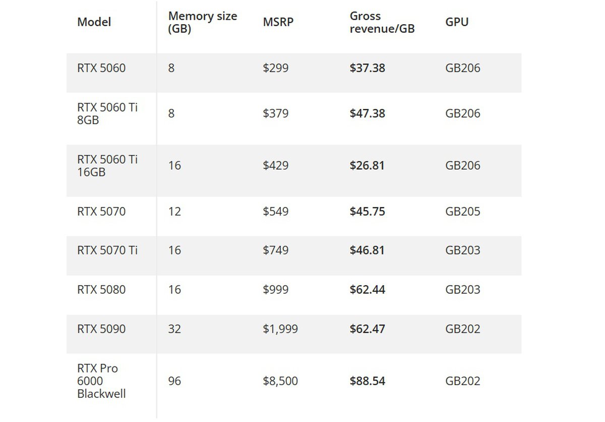 Например, в теории среди всех GeForce RTX 5060 производить выгоднее всего GeForce RTX 5060 Ti с 8 гигабайтами памяти, а невыгоднее всего — GeForce RTX 5060 Ti с 16 гигабайтами памяти.