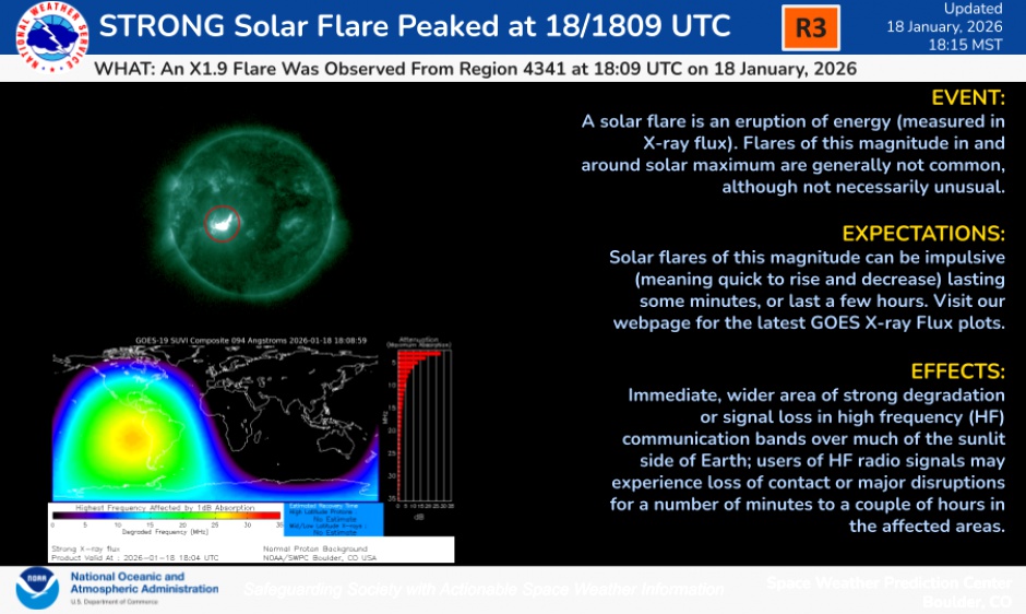 Поздно вечером 18 января на Солнце произошла вспышка максимального класса X1.95. Это первая вспышка такого класса в 2026 году, в прошлый раз вспышки максимального класса наблюдались еще в 2025 году.