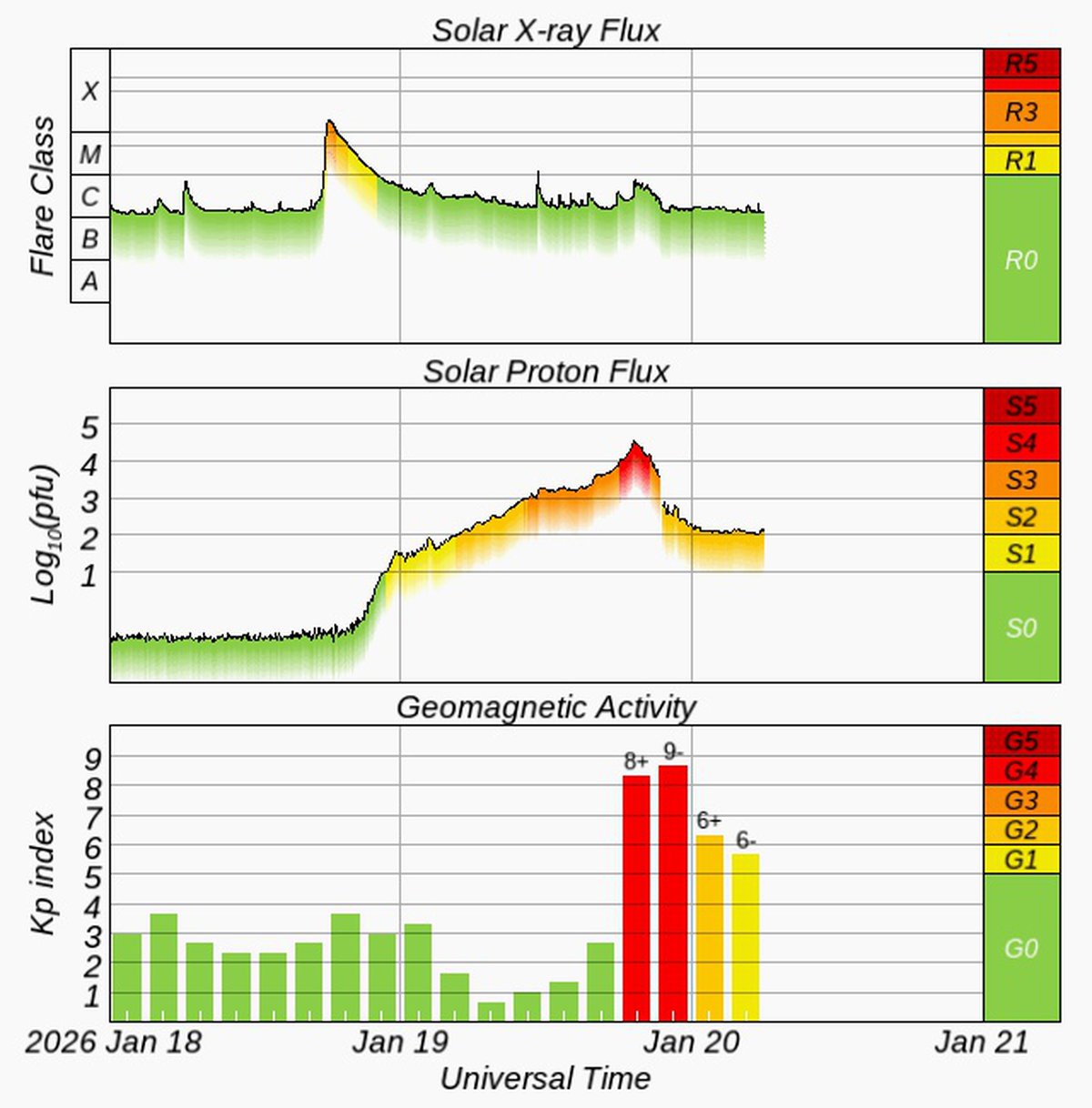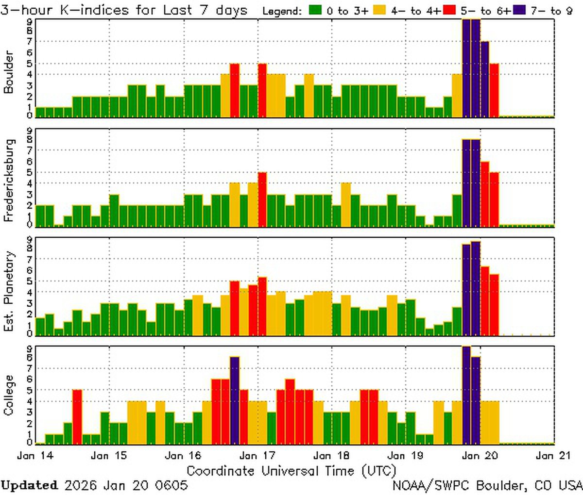 Предполагалось, что геомагнитная буря 20 января начнется с класса G1, постепенно усилится до G4, а затем будет оставаться на уровне класса G2-G3 большую часть дня. Пока детекторы NOAA рисуют другую картину.