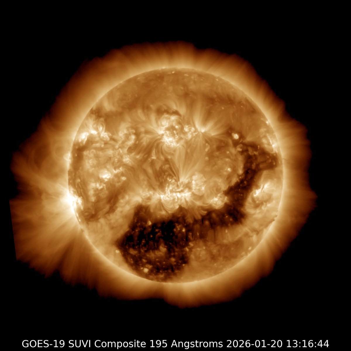 Поток частиц из корональной дыры в атмосфере Солнца не прервется еще несколько дней, но его интенсивность будет снижаться. Если верить модели, Земля выйдет из потока частиц в районе 24 января.