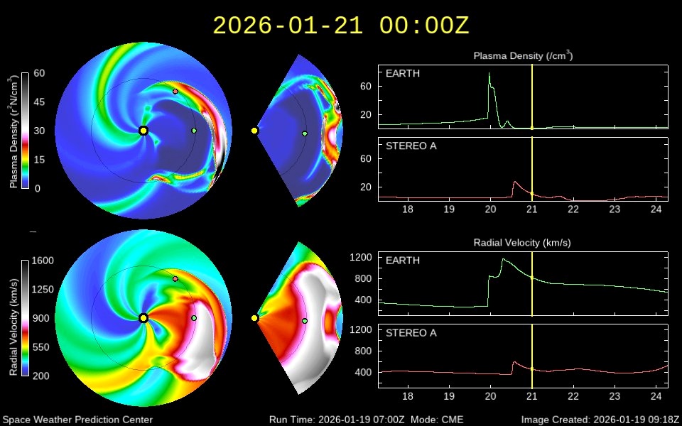 Судя по модели распространения солнечного ветра WSA-Enlil, к этому моменту Земля покинет плотный фронт плазмы из основной части коронального выброса, однако останется в потоке быстрых частиц. Скорость потока будет на уровне 700-800 километров в секунду.