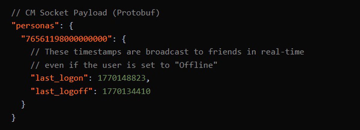 Анализ служебных сообщений Steam раскрывает параметры last_logoff и last_logon для каждого из друзей пользователя вне зависимости от любых настроек приватности. Таким образом, пишет исследователь, ему удалось приблизительно восстановить расписание сна «цели».