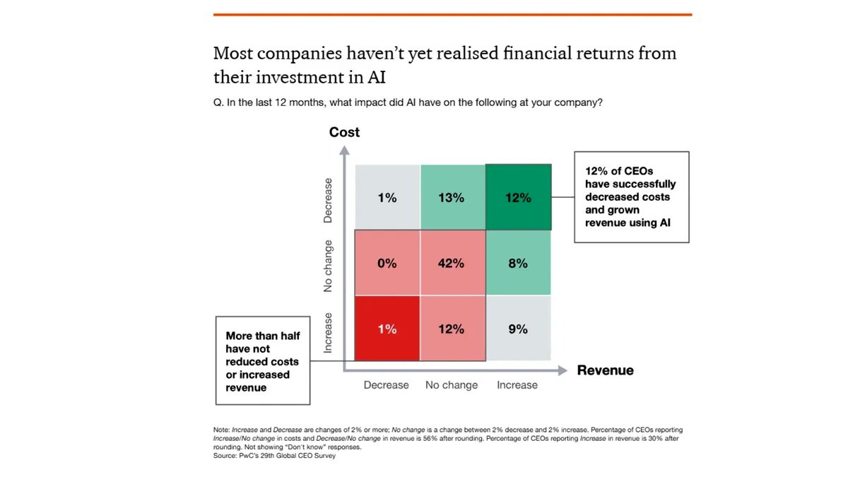 Согласно отчету консалтинговой компании PricewaterhouseCoopers, корпоративное внедрение инструментов на базе ИИ пока не оправдывает самых оптимистичных ожиданий. Лишь 12% из опрошенных 4454 генеральных директоров сообщили о росте доходов и падении затрат в результате внедрения ИИ.