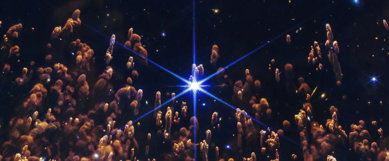 Цветовая палитра изображения напрямую связана с физическими характеристиками вещества. Синие оттенки указывают на наиболее нагретые области, желтые — на зоны с молекулярным водородом, а красные — на самые холодные и разреженные участки, где начинается образование пылевых частиц.