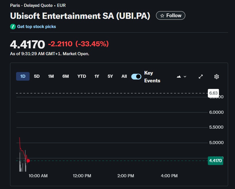 Акции Ubisoft резко упали после открытия торговой сессии 22 января. На старте торгов стоимость акций компании упала более чем на 33%, впервые за много лет капитализация Ubisoft упала значительно ниже 1 миллиарда евро.